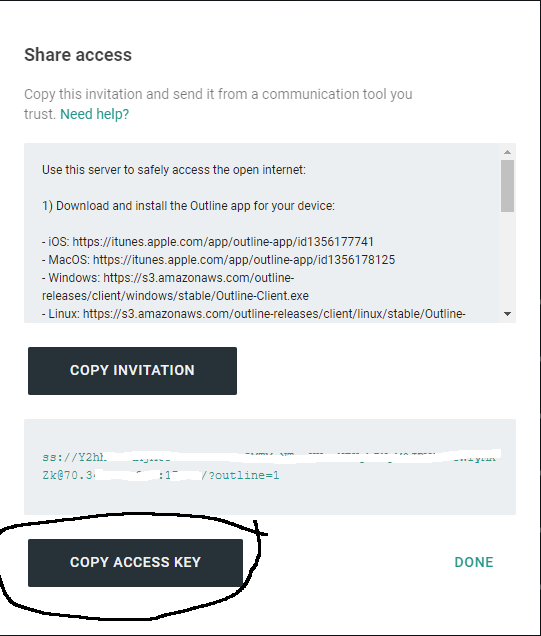 We copy the access key, it contains the IP address of the server and the connection port and password in encrypted form