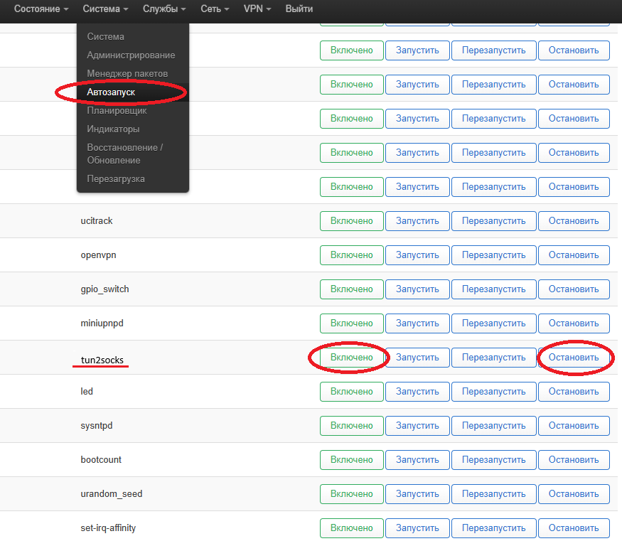 Система – Автозапуск и Включено напротив tun2socks, после нажатия Включено изменится на Отключено