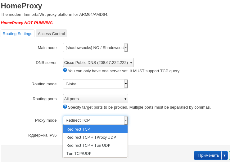 Proxy Mode — Redirect TCP (перенаправление только TCP трафика, согласно правилам Homeproxy, а не основного firewall).