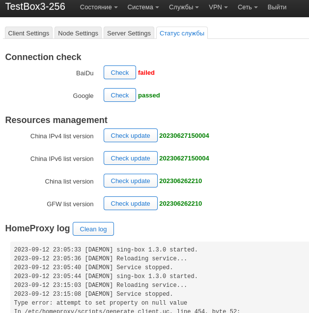 Проверить статус работы и логи, а также подключение к Baidu и Google можно во вкладке Статус Службы.