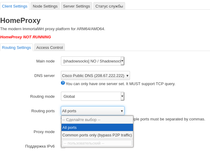 Routing Ports — All Ports, если хотите перенаправлять все порты в Main Node или Common ports only (порты до 1024, всё что выше будет идти через шлюз по умолчанию).