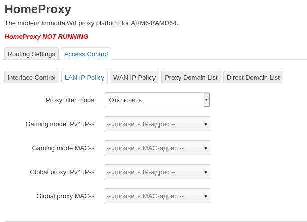 Global Proxy IPv4/MAC — проксирует весь трафик для выбранных устройств.