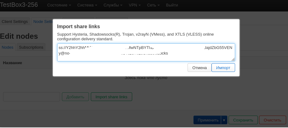 Нажимаем Import share links и добавляем конфигурацию shadowsocks (outline), vless, trojan или иную.