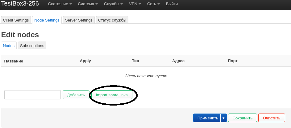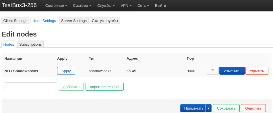 Сперва нужно добавить сервер, для этого переходим во вкладку Node Settings