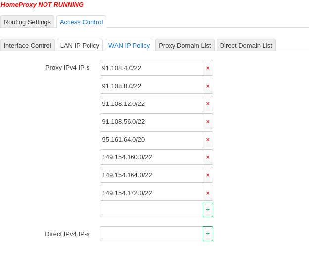 Диапазоны адресов для WAN для проксирования (Proxy IPv4 IP-s) / направления в шлюз по умолчанию (Direct IPv4 IP-s).