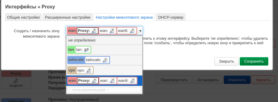 Выбрать Протокол неуправляемый, из списка устройств singtun0, присвоить название, например Proxy и Создать интерфейс.