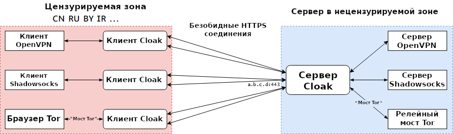 Cloak — это подключаемый транспорт, который расширяет возможности традиционных прокси‑инструментов, таких как OpenVPN, для обхода сложной цензуры и дискриминации данных.
