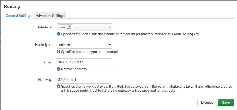 И добавляем новый маршрут через шлюз по умолчанию до своего VPN сервера.