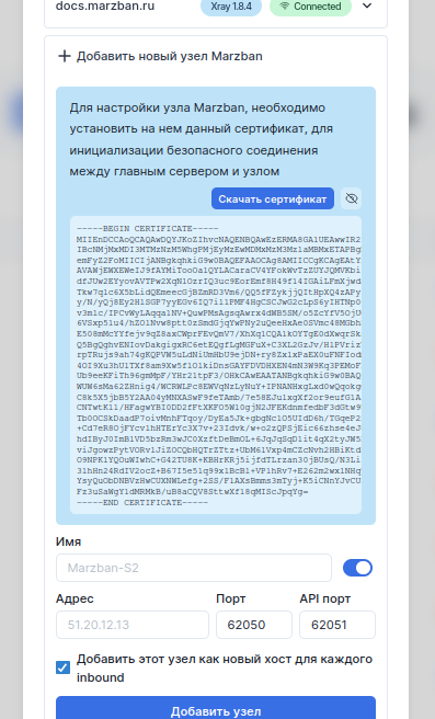 Теперь нам необходимо разместить ключ центральной панели на узле, для этого мы можем скопировать ранее полученный ключ по пути /var/lib/marzban-node/ssl_client_cert.pem