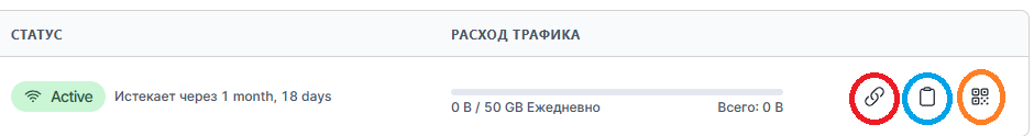 Для копирования ссылки на подписку на конфигурации – первая кнопка (красный), для копирования созданных конфигураций – вторая (синий), для просмотра QR-кодов подписки и конфигураций – третья кнопка (оранжевый)