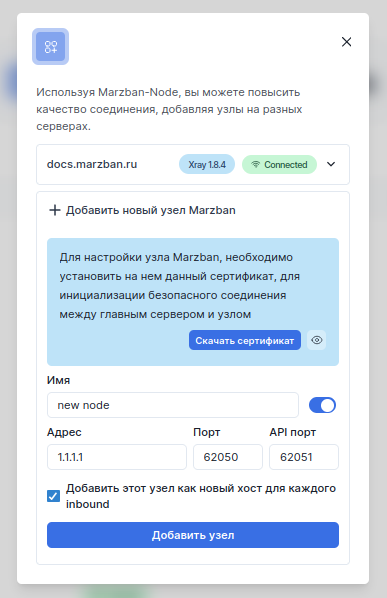 Если Вы не нажали галку добавить узел в качестве нового хоста во все входящие, Вы всегда сможете добавить узел в любой inbound, после ее подключения, просто указав ее адрес (IP или домен/суб-домен)