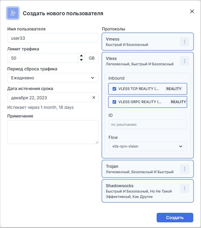 Можно задать имя пользователя, лимит трафика и срок сброса лимита, дата истечения конфигурации и примечание